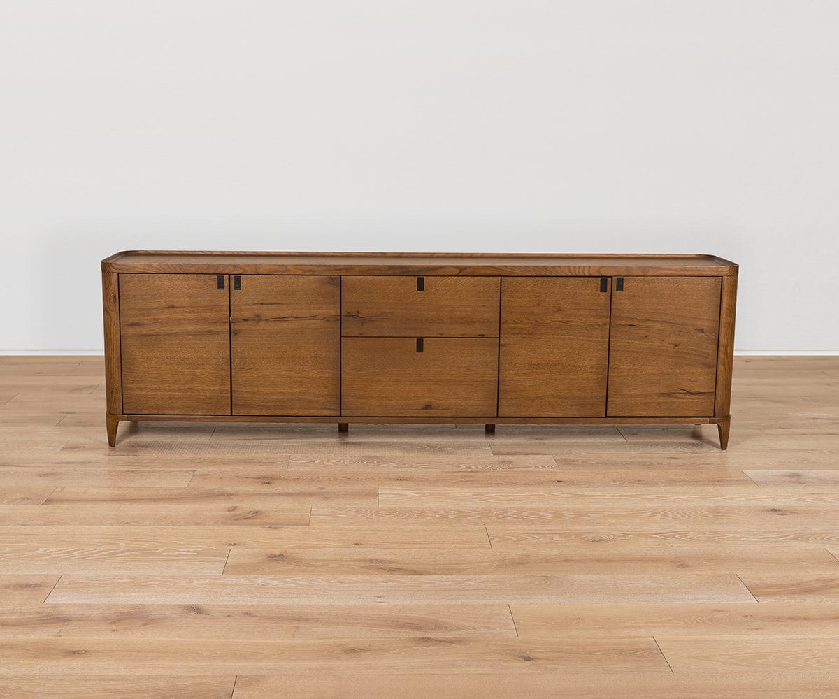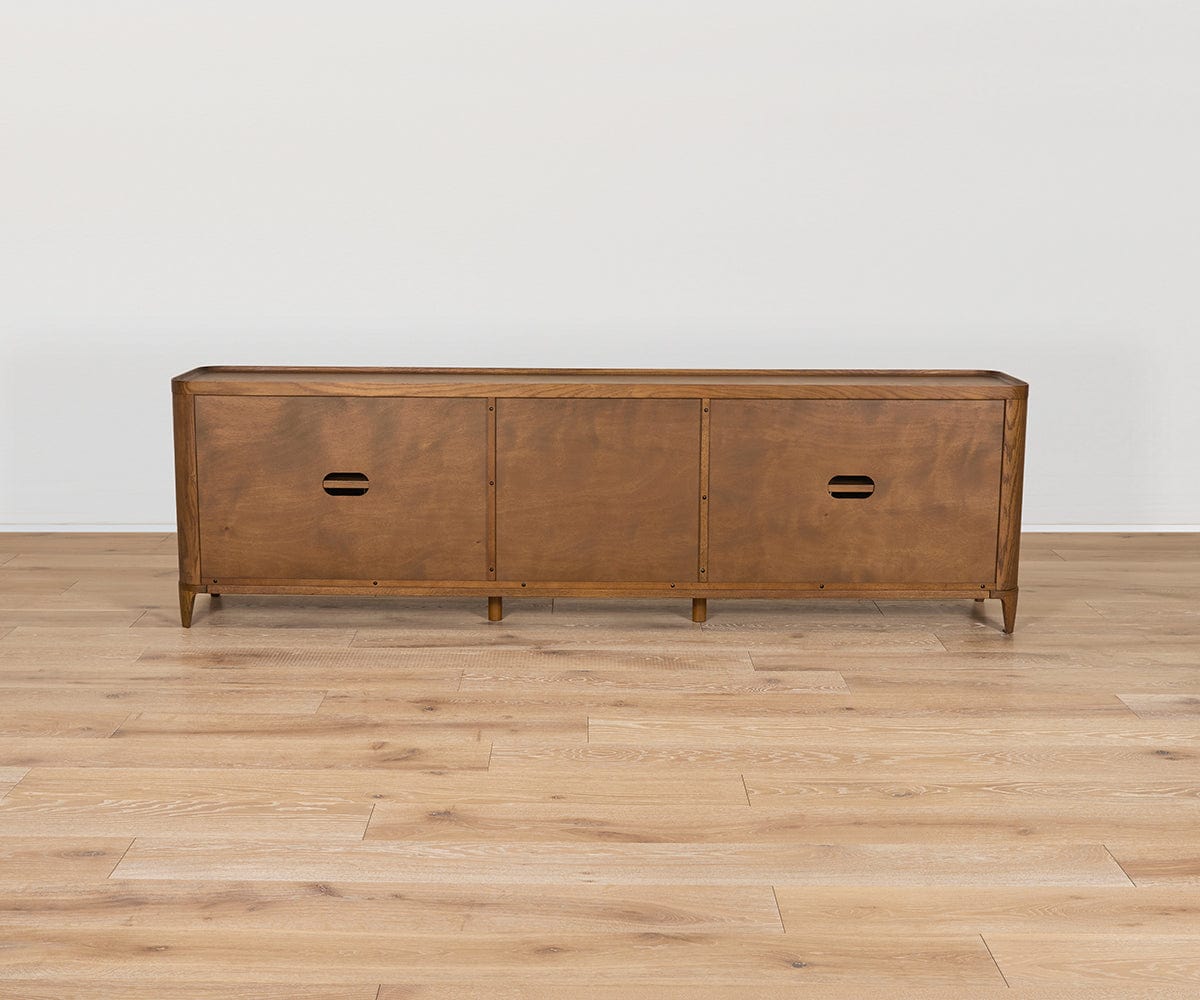Fabriqué en chêne massif avec une belle finition foncée, le meuble multimédia Aden, de style milieu du siècle, présente un design polyvalent aux bords arrondis pour une allure plus douce et épurée. Parmi les autres caractéristiques, citons des poignées de tiroir qui s'ouvrent et se ferment pour un profil minimaliste, un rebord unique sur le bord supérieur et des tiroirs et portes à fermeture amortie pour protéger les doigts et le contenu. Associez-le aux autres pièces de la collection Aden pour créer un ensemble élégant et complémentaire.